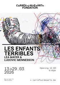 Les enfants terribles Léa Mayer/ Ludovic Mennesson du 12 au 29 mars , Galerie de la Fondation du Carrefour des arts, Rue du Canal, 77-79 1000 Bruxelles L’exposition en duo de Léa Mayer et Ludovic Mennesson est née d’une envie
