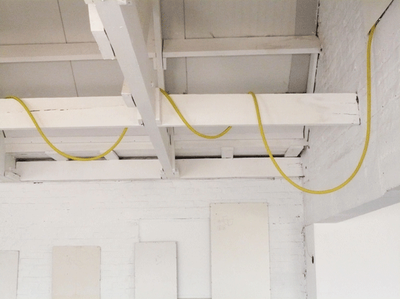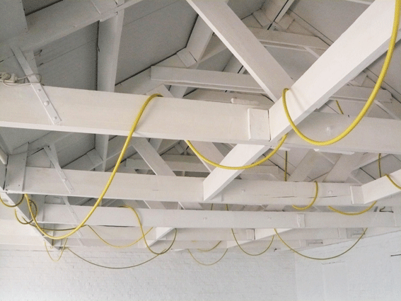 A hose goes through the exhibition’s building, wanders in a room and lets a thin waterdash drop outside. The exhibition perspires in the street.