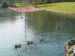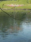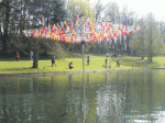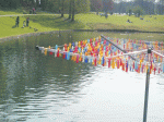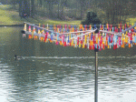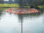 « La toile » , located in a pond in Woluwe park , is a coloured sculpture made of a drying rack and several coloured clothes pins. These domestic items form a impressionist and ready-made painting in the middle of water.