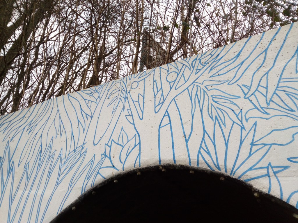 Partant d’un tunnel piéton autoroutier dont les ouvertures évoquaient pour l’artiste deux yeux, cette fresque est un clin d’œil au principe de vision stéréoscopique et invite le spectateur à parcourir l’espace. Les dessins de plantes utilisées rappellent une nature sauvage et exotique contrastant avec l’infrastructure autoroutière avoisinante. Issue des tableaux du Douanier Rousseau, cette végétation luxuriante invite le visiteur à faire la traversée…