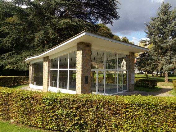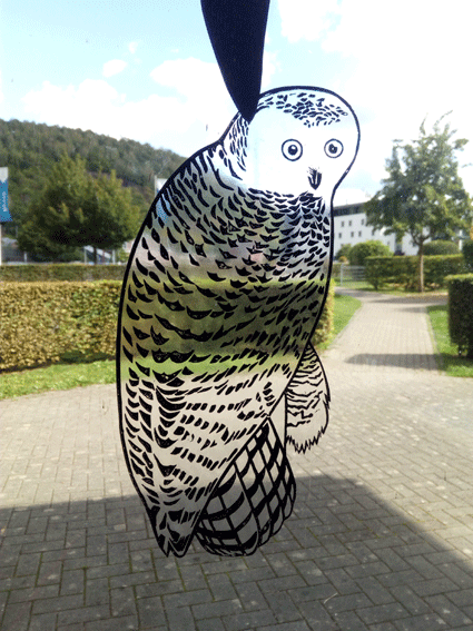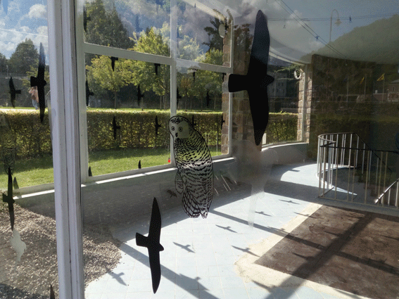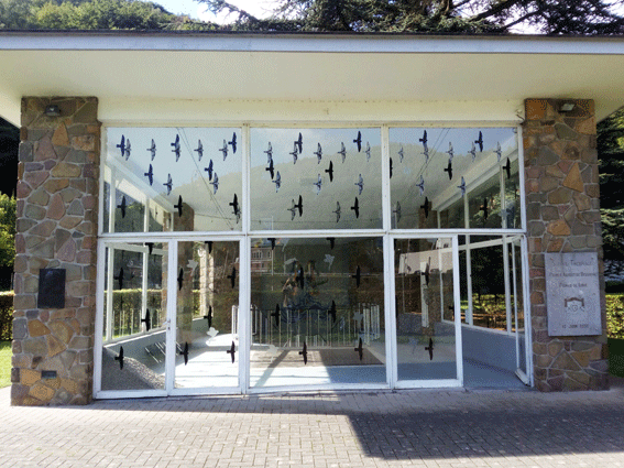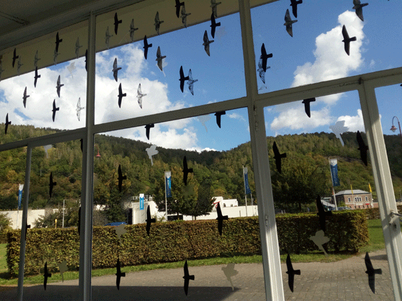 Intervention temporaire sur le Pavillon Fourmarier dans le cadre du festival des 5 saisons à Chaudfontaine. En réponse à l’architecture de verre du bâtiment, une série de motifs d’oiseaux se déploie sur la façade vitrée du pavillon. Habituellement utilisés pour empêcher les volatiles de percuter les habitations, ces motifs sont ici disposés de manière à former une composition dynamique qui dialogue avec le spectateur et les œuvres intérieures.