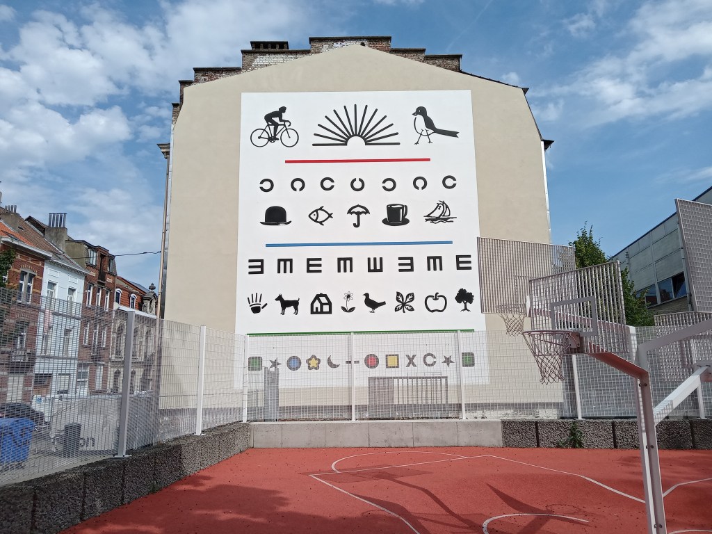 Les signes présentés sont tous issus de l’univers médical et plus précisément ophtalmologique. Ce sont donc des images ready-made (ou optotypes pour les intimes) qui ont été choisies pour leur caractère universel. Tout le monde pourra identifier ces pictogrammes facilement et en faire sa propre interprétation. Le quartier Biestebroeck, très cosmopolite, et l’école primaire attenante convoquaient cette lecture libre des signes dans l’espace public.