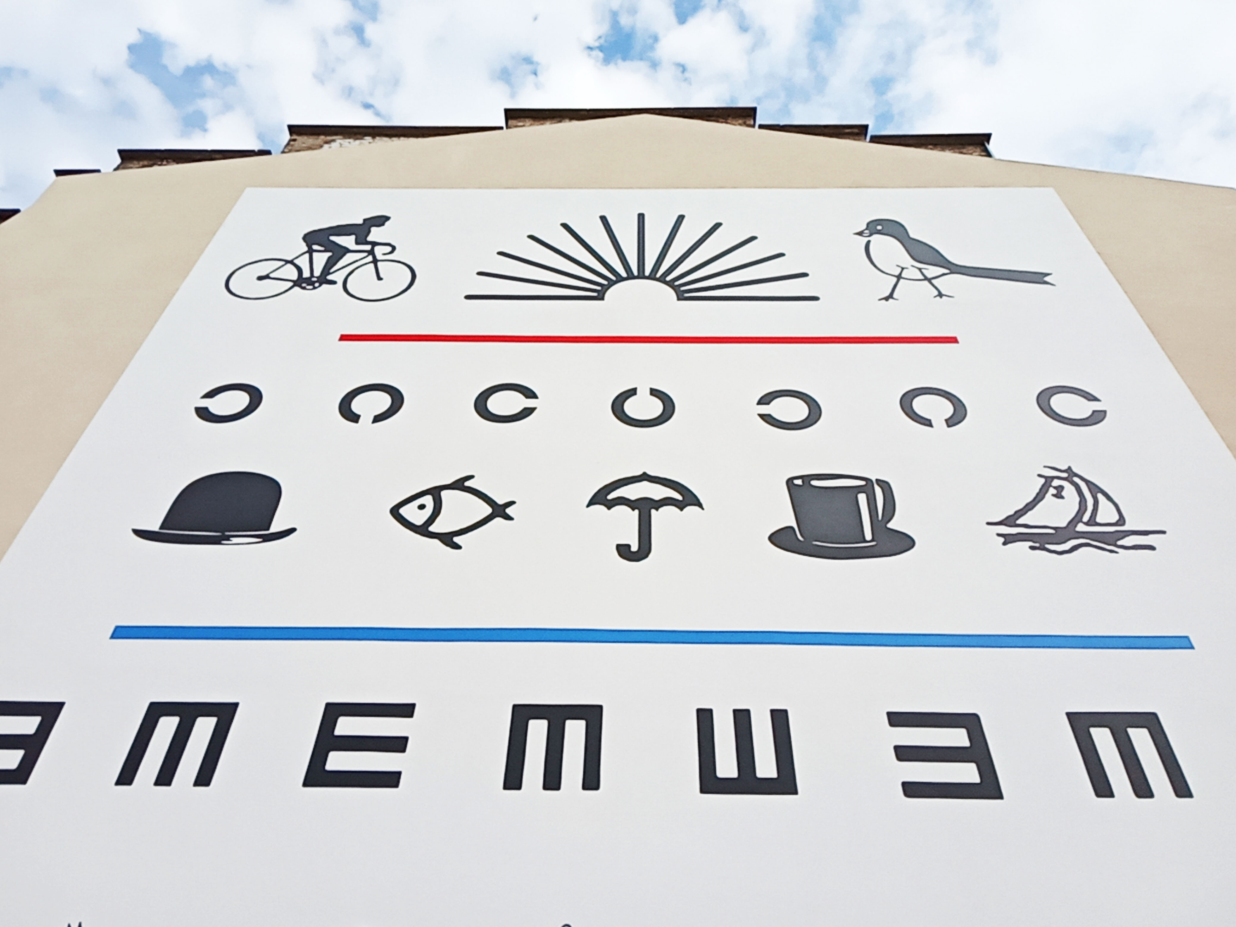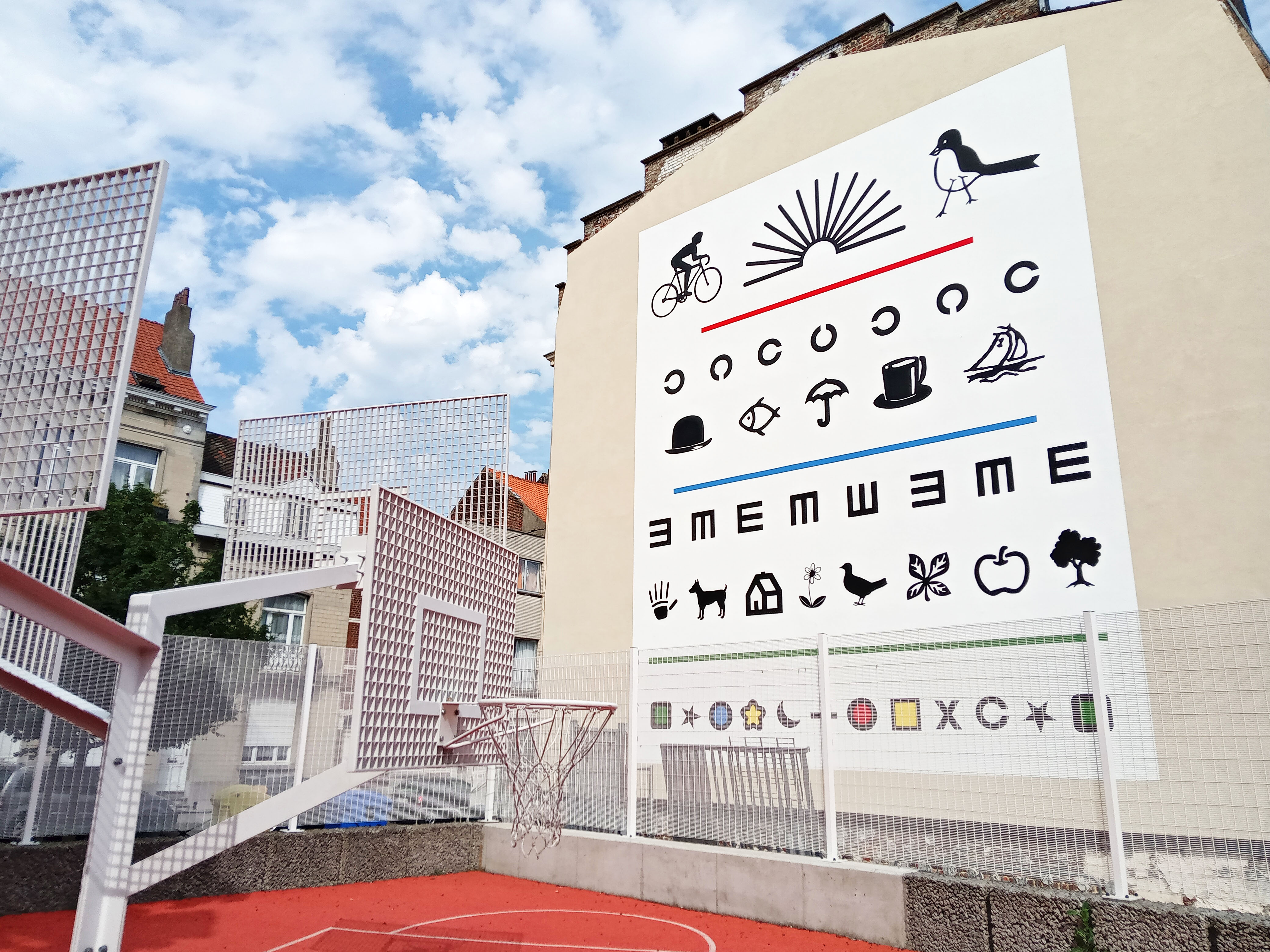 Les signes présentés sont tous issus de l’univers médical et plus précisément ophtalmologique. Ce sont donc des images ready-made (ou optotypes pour les intimes) qui ont été choisies pour leur caractère universel. Tout le monde pourra identifier ces pictogrammes facilement et en faire sa propre interprétation. Le quartier Biestebroeck, très cosmopolite, et l’école primaire attenante convoquaient cette lecture libre des signes dans l’espace public.
