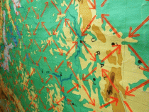 Linoleum printings and color inks. The installation run from the bottom to the top of the exhibitionwall