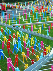 Une dizaine d’étendoirs « parapluies » parsèment un des cours d’eau de la chaine des lacs de Villeneuve d’Ascq. Depuis un pont, on observe cette installation paysagère comme on scruterait un tableau impressionniste. Mélangeant Land-Art et ready-made, l’installation La Toile propose un