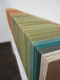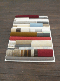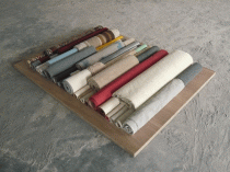 H : 30 cm / L : 160 cm / P : 120 cm Wood ; pieces of architectural intimacy : scraps from private places exposed to public viewers; fragments of rugs, linoleum, carpets, curtains … Exhibition Solstice, centre d’art